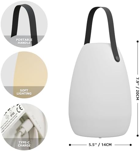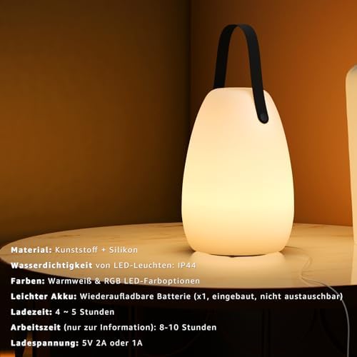 Dank des leichten Kunststoffmaterials und des praktischen Tragegriffs ist diese Tischlampe hervorragend für verschiedene Outdoor-Aktivitäten geeignet. Ob beim Camping, beim gemütlichen Abend am Lagerfeuer oder bei Partys im Garten – die Tragelampe ist Ihr idealer Begleiter. Genießen Sie die Flexibilität und die Optionen, die Ihnen diese Lampe bietet, und lassen Sie sich von der Kombination aus Funktionalität und Stil begeistern.