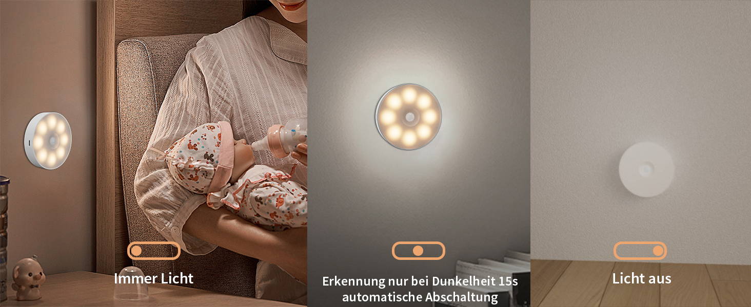 Die 8 hochwertigen LED-Lampen strahlen ein warmes und sanftes Licht aus, ideal für dunkle Räume. Dank der Flackerfreiheit wird Ihre Sicht nicht gestört, während gleichzeitig genügend Helligkeit vorhanden ist, um sicher durch die Dunkelheit zu navigieren. Vermeiden Sie die Verwendung von grellen Scheinwerfern und halten Sie so Ihre Umgebung ruhig – perfekt für die nächtlichen Besuche im Bad oder während des Aufstehens.