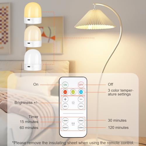 Die dimmbare Lampe lässt sich bequem per Fernbedienung steuern. Eine Fernbedienung kann mehrere Lampen gleichzeitig bedienen. Ein einfacher Knopfdruck schaltet das Licht ein oder aus, während ein Doppelklick die Farbtemperatur wechselt und ein langer Druck die Helligkeit dimmt. Zudem hat die Lampe eine automatische Abschaltfunktion, die sich nach 15, 30, 60 oder 120 Minuten aktiviert, was zusätzlichen Komfort und Sicherheit bietet.