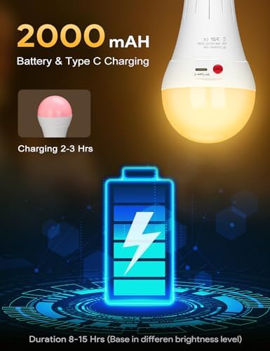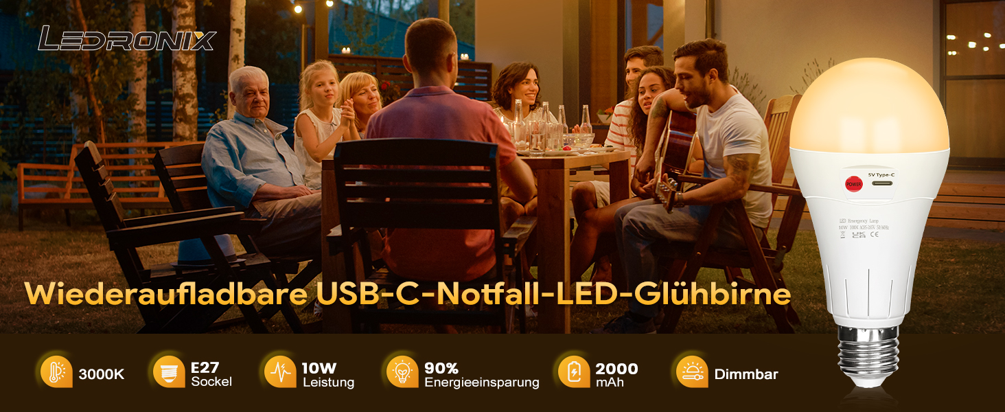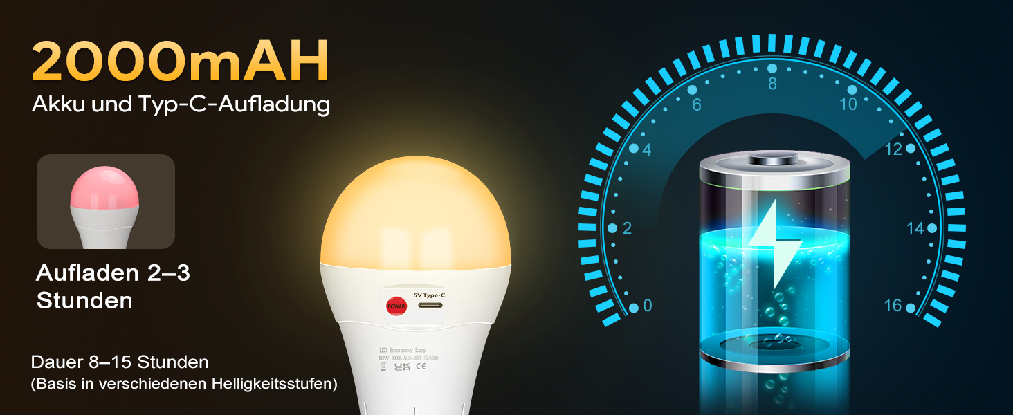 Die innovative wiederaufladbare USB-C Glühbirne bietet Ihnen eine der neuesten Generation von Beleuchtungslösungen. Sie können sie ganz unkompliziert über einen E27 Sockel in Ihre bestehenden Leuchten einsetzen oder über den praktischen USB-C-Anschluss aufladen. Mit einer leistungsstarken 2000-mAh Lithiumbatterie ist sie immer bereit für den Einsatz und benötigt zur vollständigen Aufladung nur 2-3 Stunden. Einmal aufgeladen, sorgt die Glühbirne für eine beeindruckende Leuchtdauer von 6 bis 15 Stunden, abhängig von der Helligkeitseinstellung.