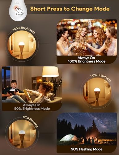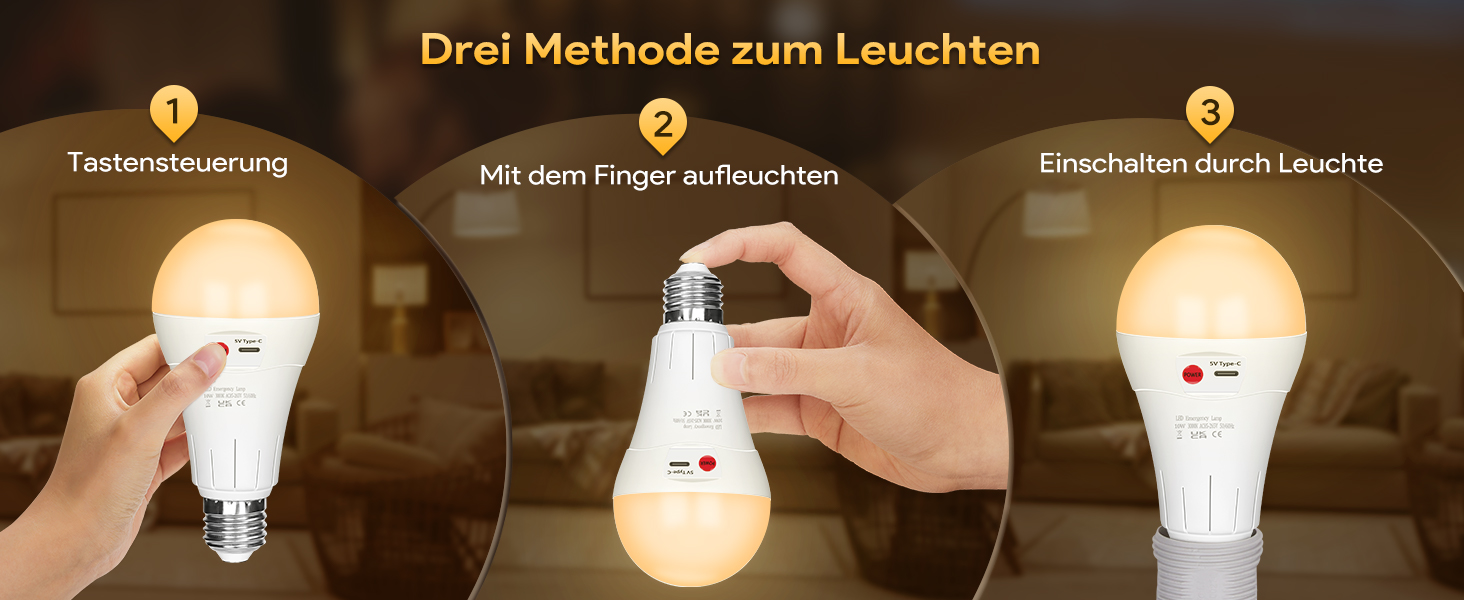 Diese LED-Notlichtlampe ist nicht nur als normale Glühbirne nutzbar, sondern auch als zuverlässige Lichtquelle in kritischen Situationen. Mit einem einfachen Druck auf die Taste schalten Sie zwischen drei Modi um: 100% Helligkeit, 50% Helligkeit und SOS-Blinken. Dies macht sie zu einem unverzichtbaren Begleiter bei Stromausfällen, Stürmen oder anderen Notfällen, sowohl drinnen als auch draußen.