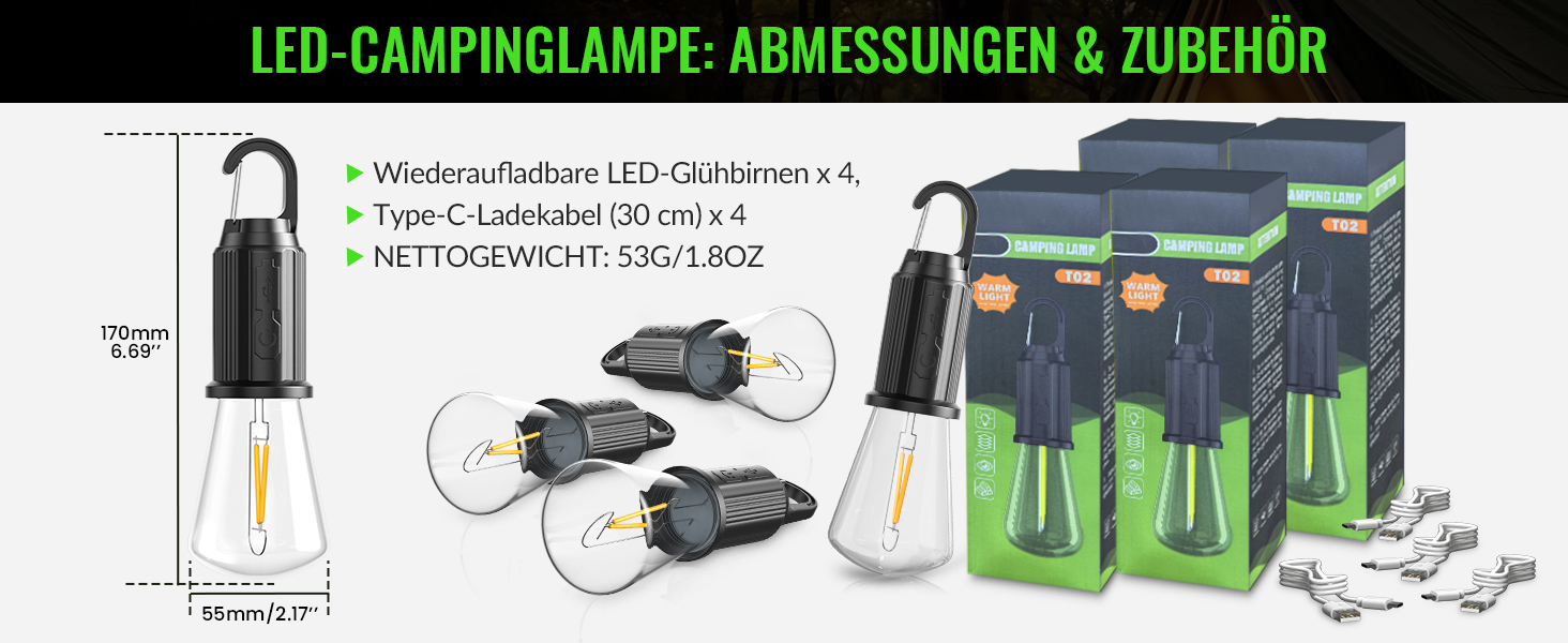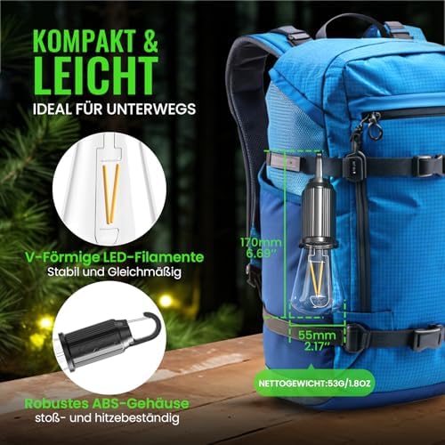 Die robuste Campinglampe ist nicht nur für Abenteuer in der Natur gedacht. Sie dient auch hervorragend als Nachtlicht oder als Notlicht bei Stromausfällen. Aufgrund ihres geringen Gewichts von nur 53,3g und ihrer kompakten Größe ist sie leicht zu transportieren und passt in jede Tasche. Ob für Festivals, Gartenpartys oder den täglichen Gebrauch zu Hause – diese vielseitige Lampe wird schnell zu einem unverzichtbaren Begleiter.
