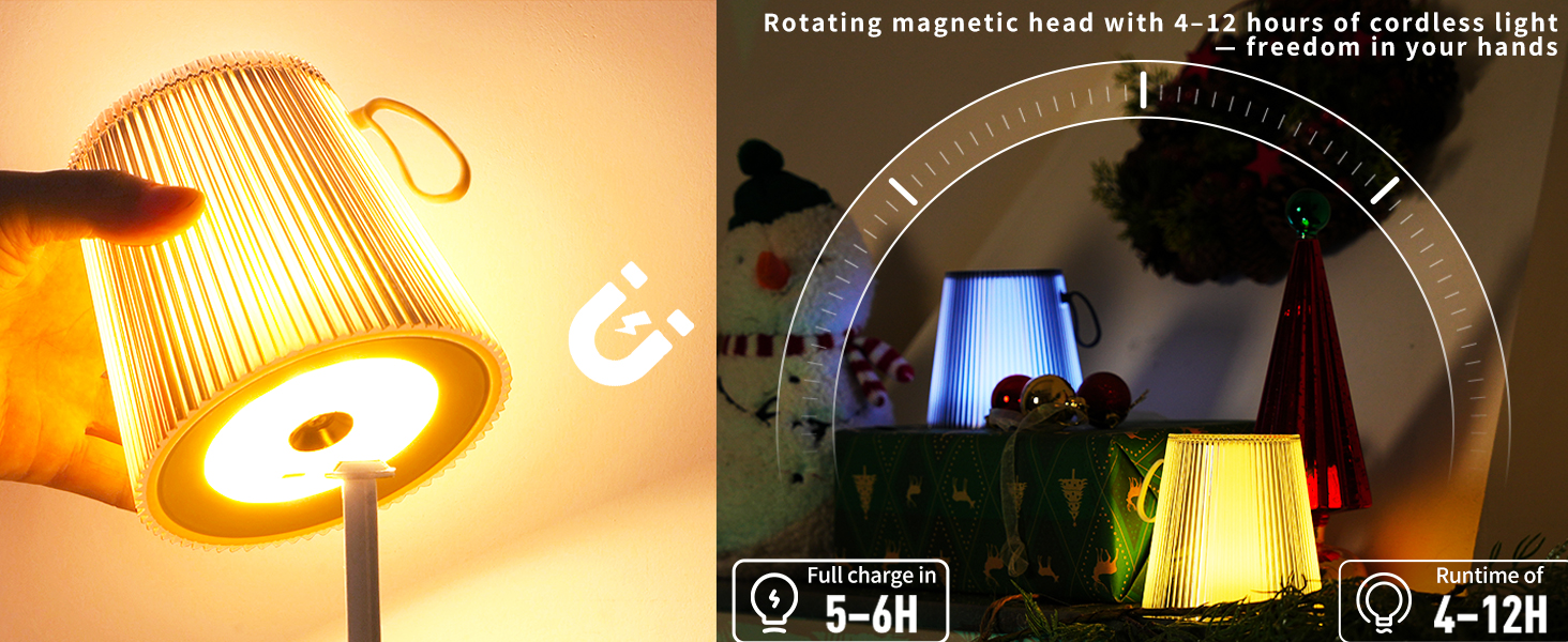 Mit einem leistungsstarken 2600 mAh Akku sorgt die kabellose Lampe für bis zu 12 Stunden ununterbrochene Beleuchtung. Bei niedriger Helligkeit kann sie Sie die ganze Nacht begleiten – sicher, praktisch und unabhängig von Steckdosen. Genießen Sie eine stimmungsvolle Beleuchtung ohne Komplikationen.