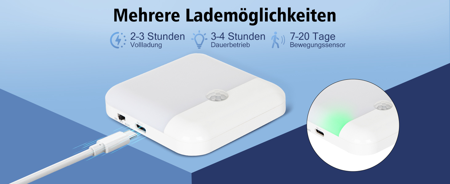 Nach nur etwa 2,5 Stunden Ladezeit sind Sie bereit für eine lange Verwendung. Im Automatikmodus kann das Licht je nach Nutzung 7–20 Tage leuchten, sodass Sie sicher aufstehen können, ohne im Dunkeln zu stolpern. Besonders wichtig ist dies für Kinder und ältere Menschen, um Stürze zu vermeiden.