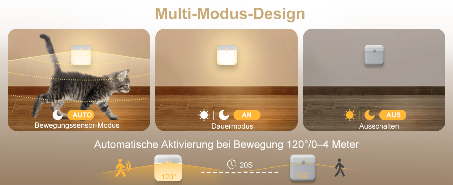 Im Automatikmodus erkennt das Nachtlicht Bewegungen innerhalb eines Bereichs von 0–4 Meter und einem Weitwinkel von 120°, um sich dann für 20 Sekunden automatisch auszuschalten. So können Sie in der Nacht sicher navigieren, ohne manuell den Schalter betätigen zu müssen.