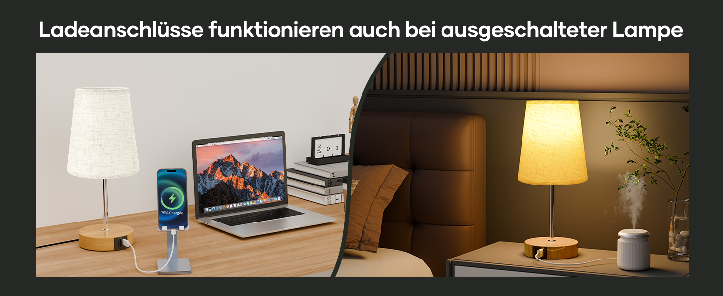 Dank der integrierten USB-A- und USB-C-Ladeanschlüsse (5 V/2,1 A) können Sie Ihre mobilen Geräte jederzeit aufladen, ohne dass dies die Funktion der Lampe beeinflusst. Auch im ausgeschalteten Zustand stellt die Lampe sicher, dass Ihre Geräte sicher und effizient aufgeladen werden, wodurch Ihr Nachttisch ordentlich bleibt.