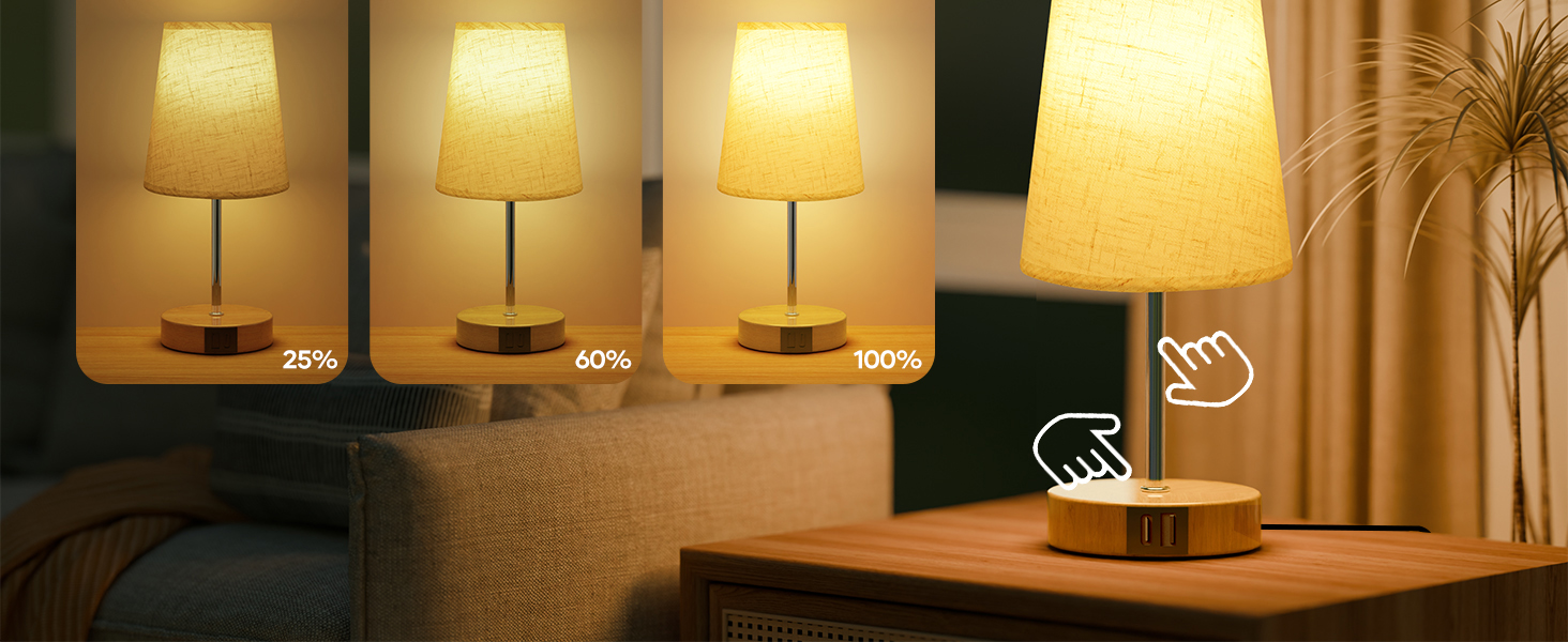 Um die Lampe zu steuern, berühren Sie einfach die Basis, um das Licht einzuschalten. Durch weitere Berührungen können Sie die Helligkeit nach Wunsch anpassen. Und das Beste: Solange die Nachttischlampe mit Strom versorgt wird, sind die USB-Anschlüsse aktiv, unabhängig davon, ob das Licht ein- oder ausgeschaltet ist.