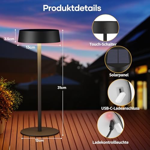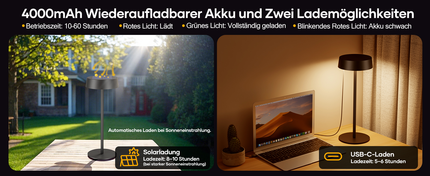 Diese Lampe bietet gleich zwei praktische Lademöglichkeiten. Die Solarladung ermöglicht ein umweltfreundliches Aufladen unter direkter Sonneneinstrahlung in 8–10 Stunden. Zusätzlich sorgt die USB-C-Aufladung für ein schnelles vollständiges Aufladen in nur 5–6 Stunden, ideal für Notfälle oder den täglichen Gebrauch, beispielsweise beim Camping oder im Garten.