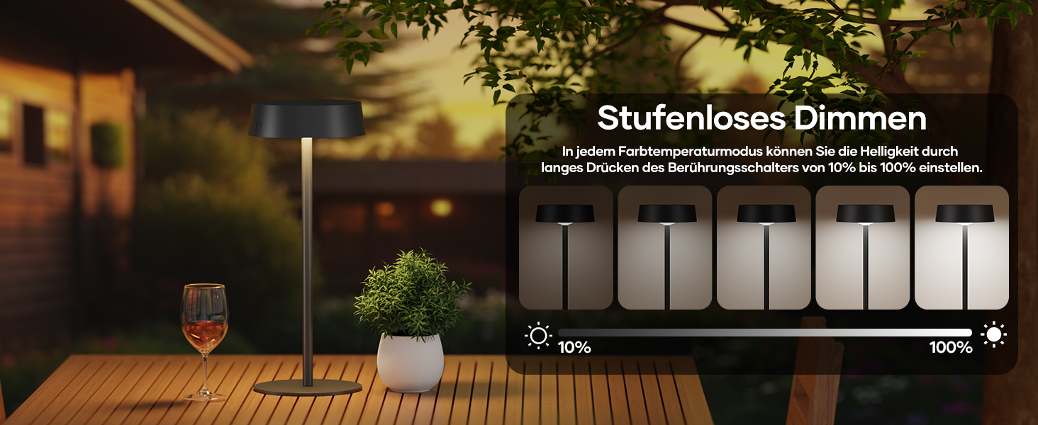 Die Tischlampe wird von einem leistungsstarken 4000-mAh-Akku betrieben, der nach vollständigem Laden 10 bis 60 Stunden Nutzung ermöglicht, abhängig von den gewählten Helligkeitseinstellungen. Diese kabellose Freiheit gibt Ihnen die Flexibilität, die Lampe überall aufzustellen – egal ob im Wohnzimmer, im Schlafzimmer oder sogar im Freien.