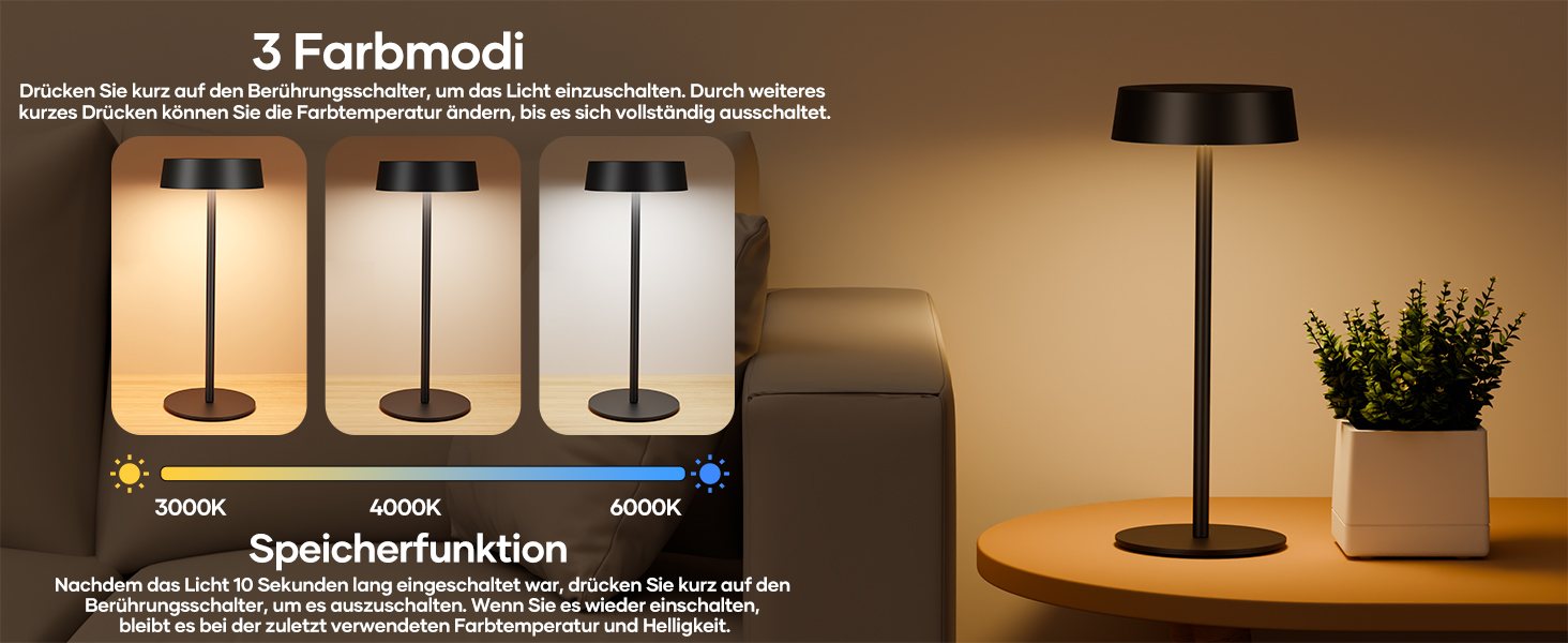 Diese innovative Tischlampe überzeugt durch ihre vielseitigen Beleuchtungsoptionen. Mit drei Farbmodi – warmes Licht (3000K), natürliches Licht (4000K) und weißes Licht (6000K) – können Sie die ideale Atmosphäre für jeden Anlass schaffen. Die stufenlose Dimmfunktion ermöglicht es Ihnen, die Helligkeit von 10 % bis 100 % individuell einzustellen. Einfach den Touch-Schalter kurz drücken, um zwischen den Modi zu wechseln und die Beleuchtung nach Ihren Wünschen anzupassen.